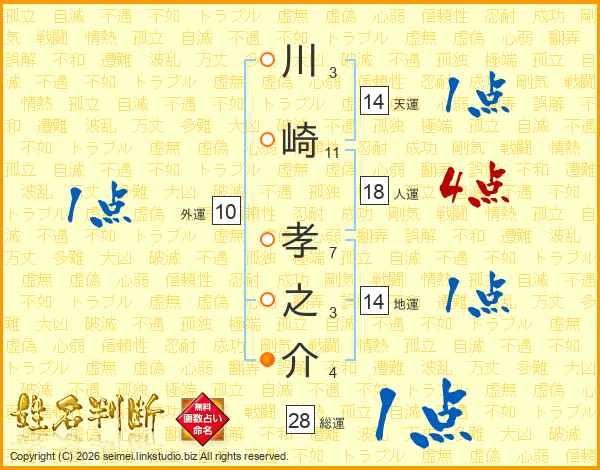 川(3画)崎(11画) 孝(7画)之(3画)介(4画)