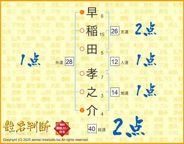 早(6画)稲(15画)田(5画) 孝(7画)之(3画)介(4画)
