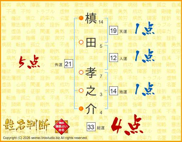 槙(14画)田(5画) 孝(7画)之(3画)介(4画)