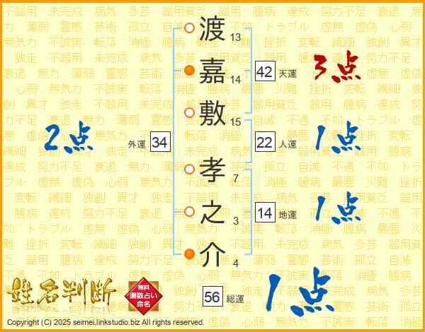 渡(13画)嘉(14画)敷(15画) 孝(7画)之(3画)介(4画)
