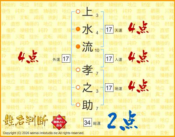 上(3画)水(4画)流(10画) 孝(7画)之(3画)助(7画)