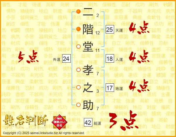 二(2画)階(12画)堂(11画) 孝(7画)之(3画)助(7画)