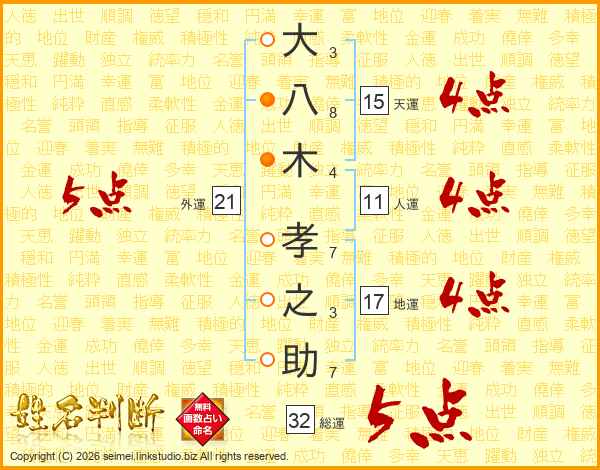 大(3画)八(8画)木(4画) 孝(7画)之(3画)助(7画)