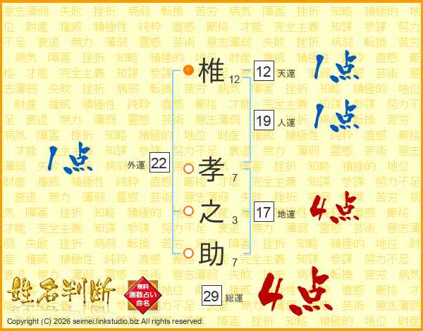 椎孝之助さんの総運は29画の4点!
