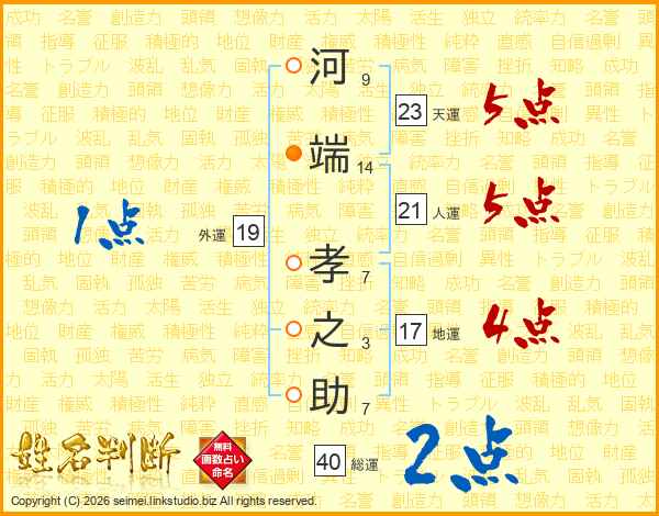 河(9画)端(14画) 孝(7画)之(3画)助(7画)