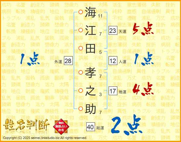 海(11画)江(7画)田(5画) 孝(7画)之(3画)助(7画)