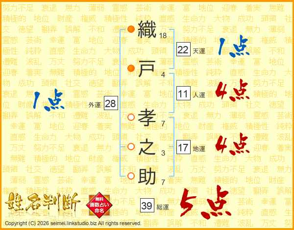 織(18画)戸(4画) 孝(7画)之(3画)助(7画)