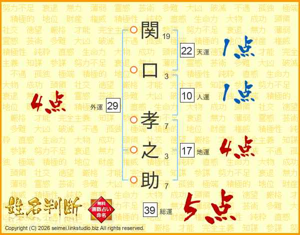 関口孝之助さんの総運は39画の5点!