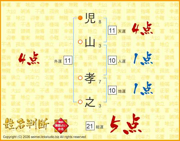 生活面を象徴する運勢です。外部から受ける影響力を表し、結婚運、家庭運や職場、環境への順応性を表します。総運から人運を引いた画数。姓や名が1文字の場合を除く。
