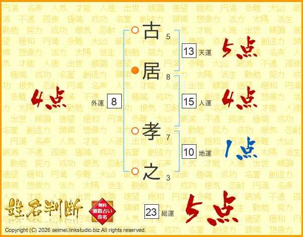 あなたの人生を表す1番重要な運勢です。生涯を通じて影響する総合運となり、主に50歳以降の晩年期に影響を及ぼします。苗字と名前の合計画数。