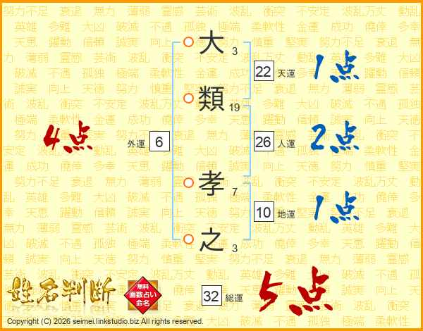 大類孝之さんの総運は32画の5点!