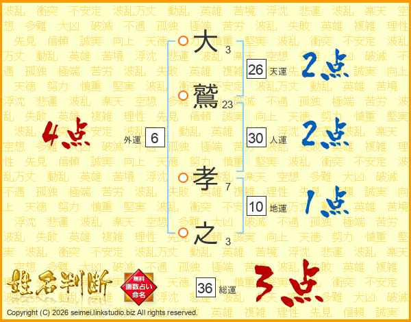 大鷲孝之さんの総運は36画の3点!