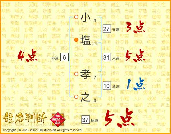 小塩孝之さんの総運は37画の5点!