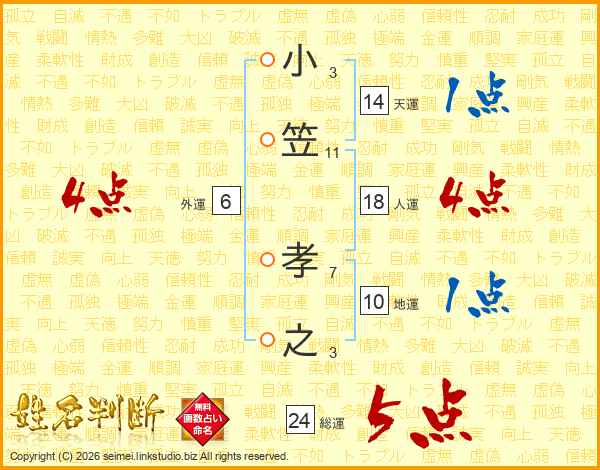 生活面を象徴する運勢です。外部から受ける影響力を表し、結婚運、家庭運や職場、環境への順応性を表します。総運から人運を引いた画数。姓や名が1文字の場合を除く。