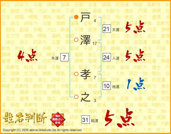 戸(4画)澤(17画) 孝(7画)之(3画)