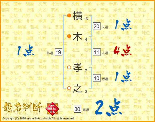 あなたの人生を表す1番重要な運勢です。生涯を通じて影響する総合運となり、主に50歳以降の晩年期に影響を及ぼします。苗字と名前の合計画数。