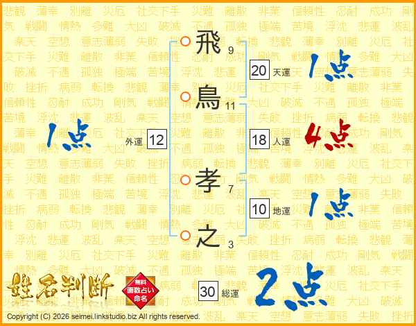 飛(9画)鳥(11画) 孝(7画)之(3画)