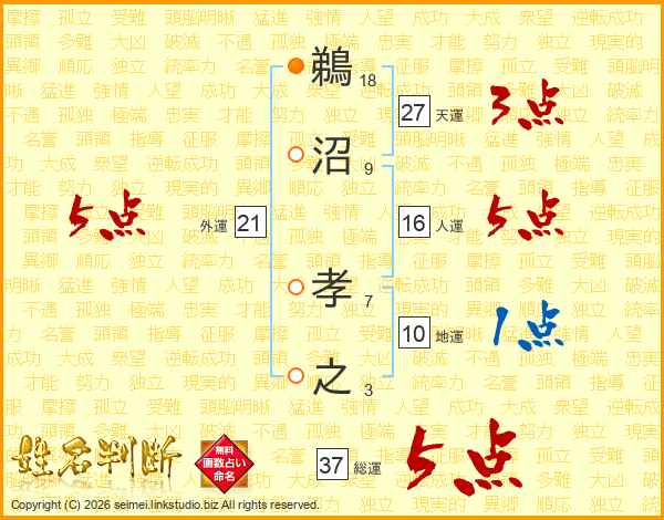 鵜(18画)沼(9画) 孝(7画)之(3画)