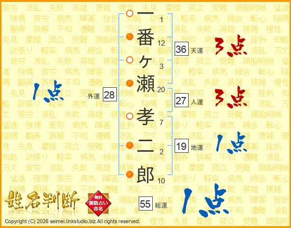 一(1画)番(12画)ヶ(3画)瀬(20画) 孝(7画)二(2画)郎(10画)