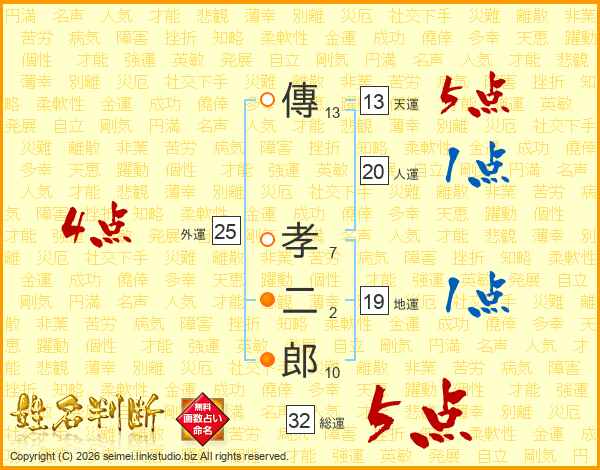 傳孝二郎さんの総運は32画の5点!