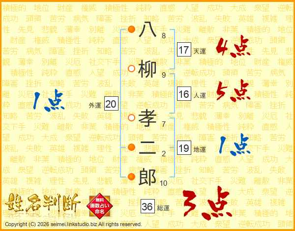 八(8画)柳(9画) 孝(7画)二(2画)郎(10画)