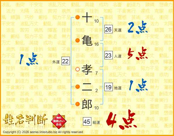 十(10画)亀(16画) 孝(7画)二(2画)郎(10画)