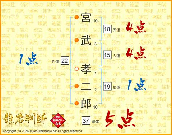 宮(10画)武(8画) 孝(7画)二(2画)郎(10画)