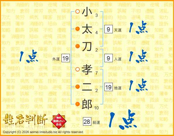 小(3画)太(4画)刀(2画) 孝(7画)二(2画)郎(10画)