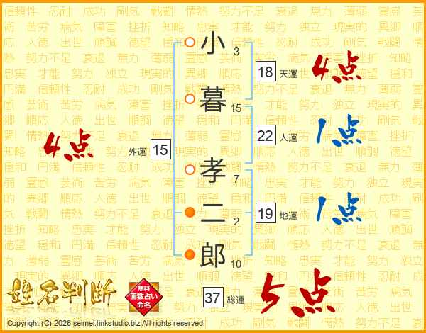 小(3画)暮(15画) 孝(7画)二(2画)郎(10画)