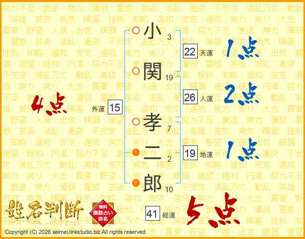 小(3画)関(19画) 孝(7画)二(2画)郎(10画)