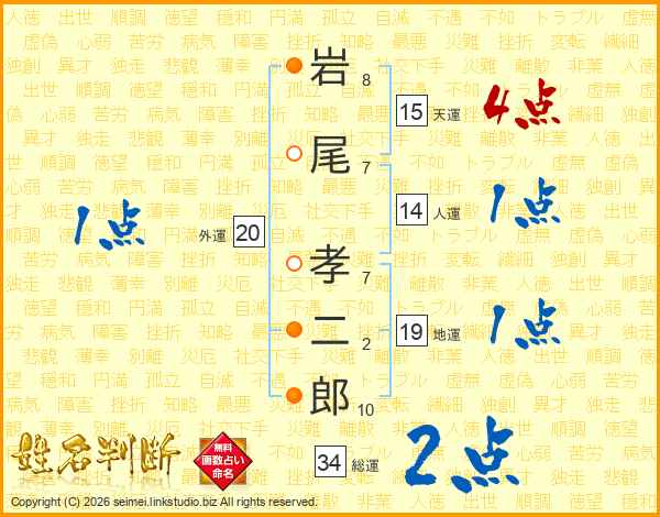岩(8画)尾(7画) 孝(7画)二(2画)郎(10画)