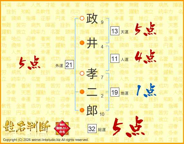 政(9画)井(4画) 孝(7画)二(2画)郎(10画)