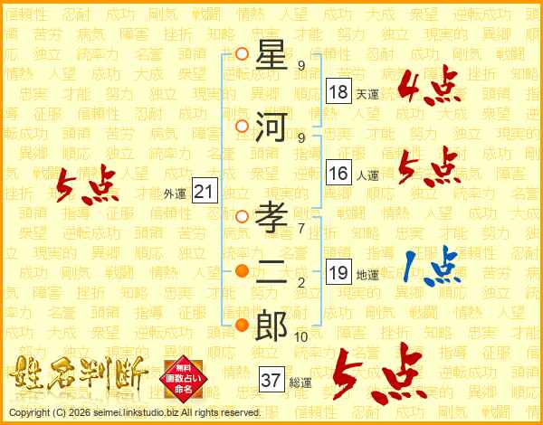 星(9画)河(9画) 孝(7画)二(2画)郎(10画)