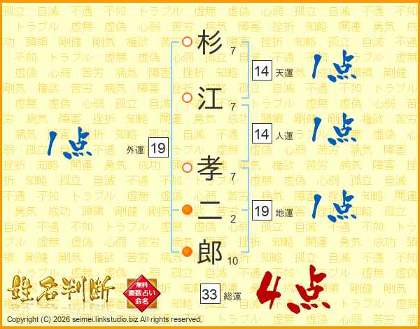 杉(7画)江(7画) 孝(7画)二(2画)郎(10画)