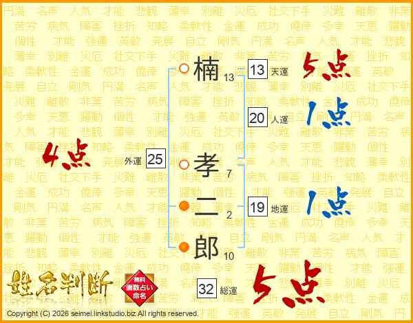 楠(13画) 孝(7画)二(2画)郎(10画)