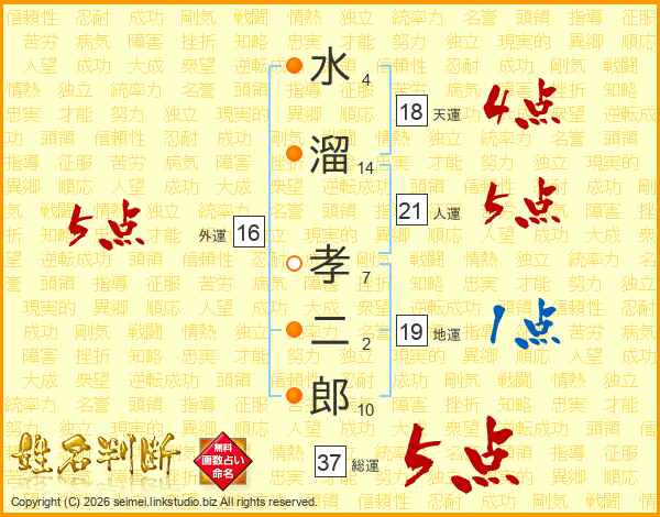 水(4画)溜(14画) 孝(7画)二(2画)郎(10画)