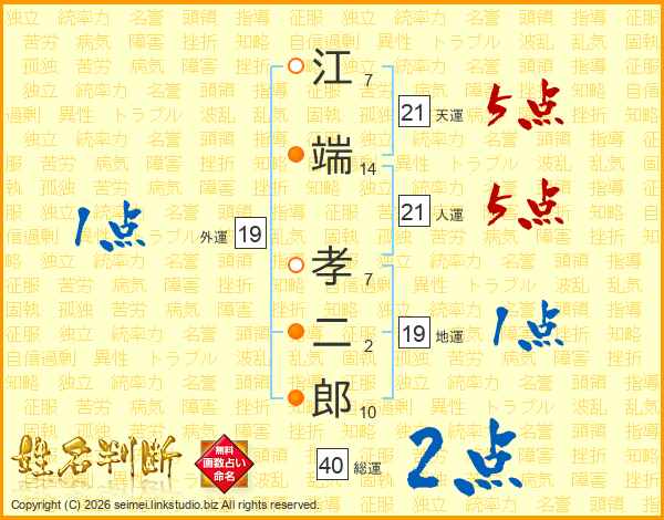 江(7画)端(14画) 孝(7画)二(2画)郎(10画)