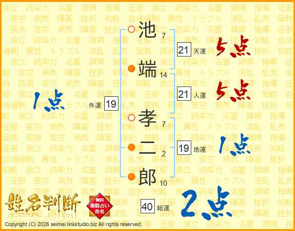 池(7画)端(14画) 孝(7画)二(2画)郎(10画)