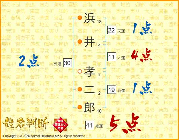 浜(18画)井(4画) 孝(7画)二(2画)郎(10画)