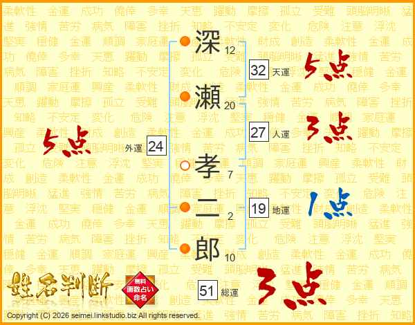 深(12画)瀬(20画) 孝(7画)二(2画)郎(10画)