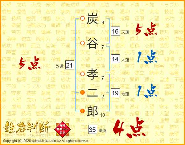 炭(9画)谷(7画) 孝(7画)二(2画)郎(10画)