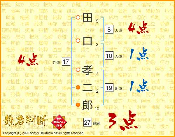 田(5画)口(3画) 孝(7画)二(2画)郎(10画)