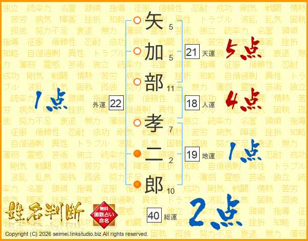 矢(5画)加(5画)部(11画) 孝(7画)二(2画)郎(10画)