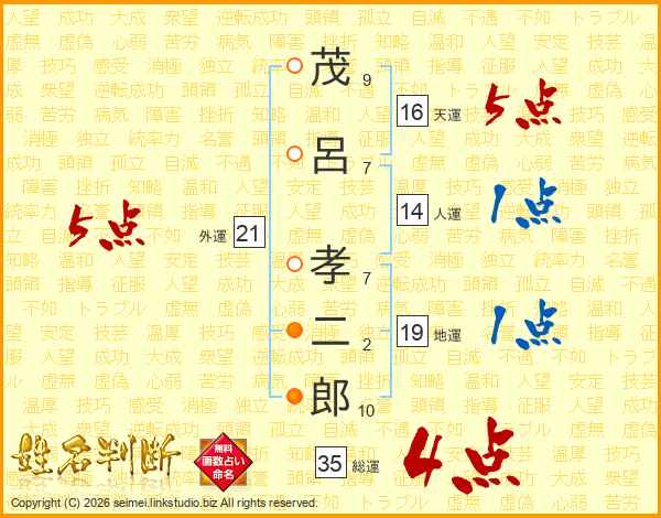 茂(9画)呂(7画) 孝(7画)二(2画)郎(10画)