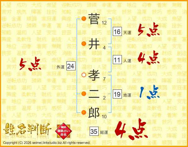 菅(12画)井(4画) 孝(7画)二(2画)郎(10画)