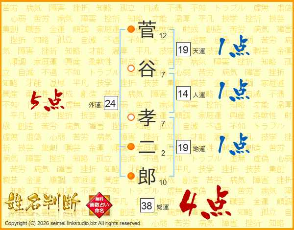 菅(12画)谷(7画) 孝(7画)二(2画)郎(10画)