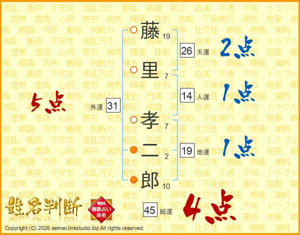 藤(19画)里(7画) 孝(7画)二(2画)郎(10画)