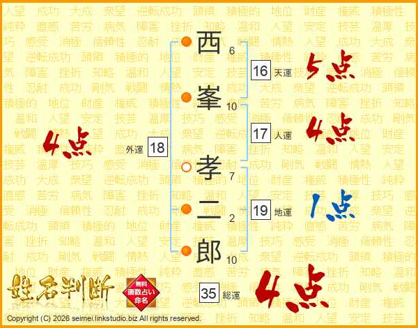 西(6画)峯(10画) 孝(7画)二(2画)郎(10画)