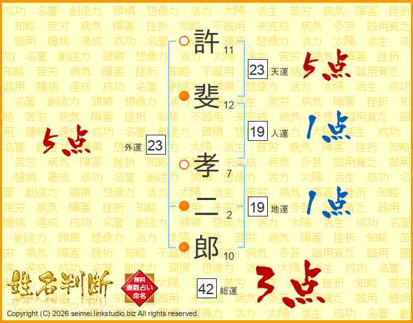 許(11画)斐(12画) 孝(7画)二(2画)郎(10画)