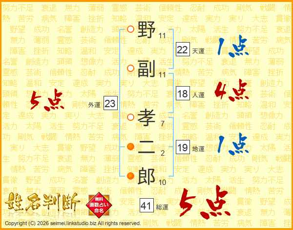 野(11画)副(11画) 孝(7画)二(2画)郎(10画)